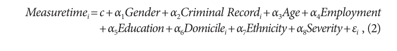 等式左侧的因变量测量强制措施的严重性。等式右侧是一组解释变量,包括被告人的法律和法外特征,即性别、犯罪记录、年龄、就业、教育、户籍和种族。我们还使用检察官的量刑建议控制了犯罪的严重性(严重性),c为常数,ε为误差项。