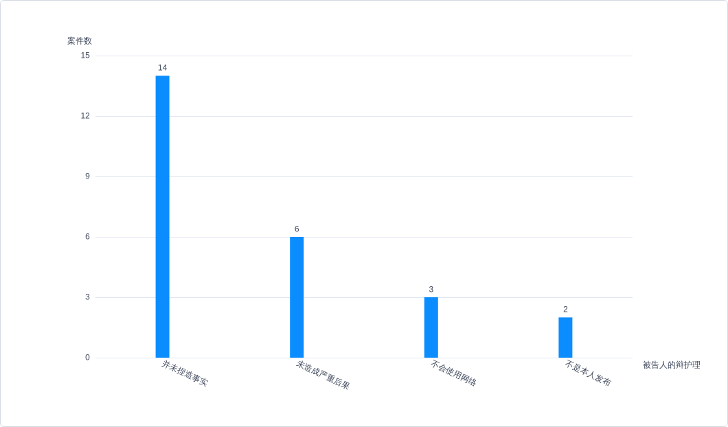 如上图所示,在45个写明被告人意见的判决书中,“并未捏造事实”为最常见意见,有14个,占比10.07%;其次是未造成严重后果,有6件,占比4.32%;再次是以不会使用网络为由,有3件,占比2.16%;而以不是本人发布为由的案件仅有2件。