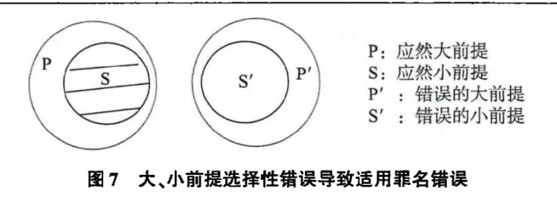 此案中,辩护人提出合办公司获取的利润不应计入受贿数额,该意见的大前提是:合办公司→获取合法利润(P′),小前提是:被告人与请托人合办公司(S′),所以得出结论:被告人获取的是合法利润。此种观点的错误在于认为凡是以“合办公司”的形式,获得的就是合法收入,显然没有考虑未实际出资或参与经营这类“不劳而获”的情况,扩大了大前提(P)的范围,与此相应的,也选择性的忽略了案件事实(S)中被告人没有实际出资和经营的要素,扩大了小前提。上图中S(阴影部分)与P应当不重叠,但由于分别被放大为S′和P′,导致错误的涵摄。
