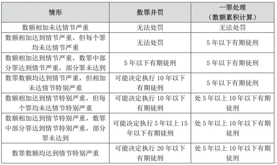 最后,数罪并罚与一罪数额累计计算之间孰轻孰重不宜脱离具体案件进行抽象区分,但从整体上看,在有期徒刑范围内,数罪并罚可判处的刑罚区间更广,有可能更重;涉及到无期徒刑、死刑时,数额累计计算可能直接达到判处无期徒刑、死刑的标准从而直接改变刑罚性质,因此有可能更重。具体到本罪,因只限于有期徒刑,数罪中根据各罪犯罪数额的不同,具体可分为以下几种情形: