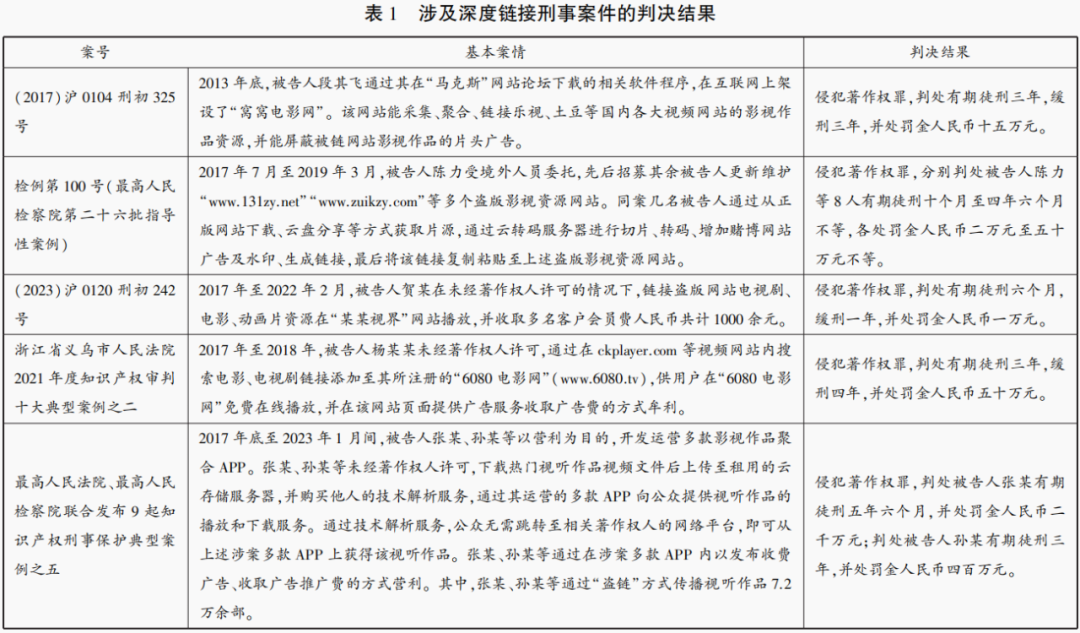 如下表所示,本案裁判的价值不仅在于明确了深度链接行为的刑事违法性,为后续的刑事判决提供了可借鉴的范本,更在于为网络服务提供者的行为边界划定了清晰坐标:技术中立原则不能成为规避法律责任的“护身符”,任何借助技术手段实质介入作品传播、牟取非法利益的行为,均需承担相应的刑事责任。从更宏观的视角看,本案亦折射出刑民法律在知识产权保护中的协同与互动——民事侵权认定为刑事规制提供事实基础,刑事司法对严重侵权行为予以沉重打击,二者共同服务于版权保护。