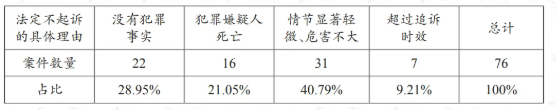 此外,在法定不起诉的适用理由上地区差异也同样存在。为了解醉驾案件法定不起诉的具体实践状况,笔者在小包公法律实证研究平台数据库检索了2021年各地检察机关法定不起诉的76起醉驾案件,具体适用情形及所占比例如下表:
