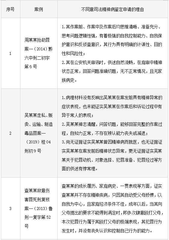 从现行立法来看,犯罪嫌疑人、被告人及其近亲属、辩护人享有精神病鉴定的申请权。问题是,司法实践中,犯罪嫌疑人、被告人及其近亲属、辩护人在申请启动精神病鉴定时,时常遭到拒绝。笔者通过在Alpha检索案例,整理出法院驳回司法精神病鉴定申请的常见理由如下: