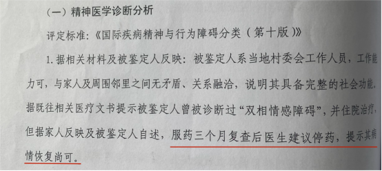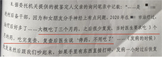 实践中,鉴定意见依据的主要材料之一就是侦查机关提供的证人证言,但有些鉴定人员却对证人证言进行错误摘录和解读。以笔者经办的某故意伤害案为例,被告人父亲笔录的原文是“问:吃了3个月药后,去医院了吗?答:没去,一方面情况好点,另一方面家里条件不允许”,但是鉴定意见却称“当时医生要求吃3个月的药,吃完复查,复查后医生说:‘停药,不用吃了’”;另被告人父亲笔录的原文是“问:出来之后发病了吗?答:少了点,4、5天一次发病”,但是鉴定意见却称“大概吃了三个月药,之后很少复发”,甚至在分析说明中错误得出“服药三个月复查后医生建议停药,提示其病情恢复尚可”的结论。