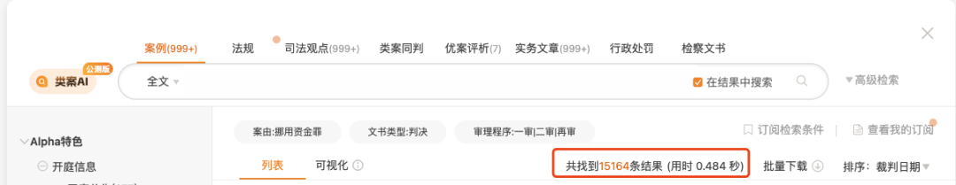 以alpha案例库为搜索平台,检索案由为挪用资金罪的一审、二审及再审判决书,截止2025年8月28日,共检索到法律文书15164份。