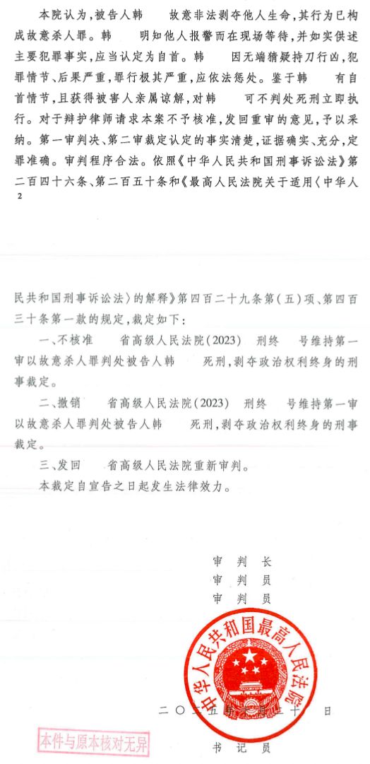 日前,北京尚权律师事务所主任毛立新律师承办、赵正武和宋雨航律师协办的韩某故意杀人死刑复核案件,收到最高人民法院作出的刑事裁定书,采纳辩护人意见,裁定不予核准被告人死刑、发回重审。