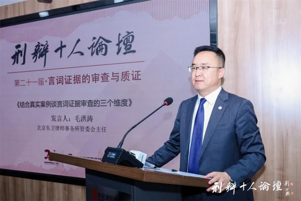 北京东卫律师事务所管委会主任毛洪涛律师作了《言词证据审查的三个维度——以三起真实案件为例》的发言。他结合亲办案件,指出言词证据审查涉及法律、事实、心理三个层面,有效辩护需从程序、客观、逻辑三个维度切入。