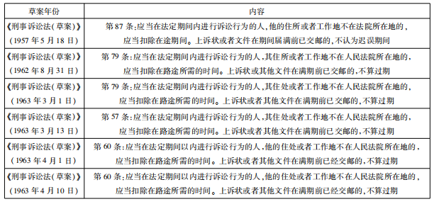 如表1所示,1979年《刑事诉讼法》通过前,历次草案条文都就“路途上的时间”与“上诉状或其他文件的交邮”作出规定。这与现行《刑事诉讼法》有关期间条款的规定是对应的。进一步比较有关“路途上的时间”的表述会发现,草案认为的“法定期间不包括路途上的时间”是指“应当在法定期间内进行诉讼行为的人,其(他的)住处或者工作地不在人民法院所在地的,应当扣除在路途所需的时间(在途时间)”。据此,立法机关在制定《刑事诉讼法》之初就认为,路途上的时间不仅是诉讼文书的在途时间,还包括或者主要是指诉讼参与人的在途时间。随着1979年《刑事诉讼法》的确立,与草案条文相对应的立法条款在形式和内容上并无实质变化,而且经历三次修法也未有任何变动。由此推断,“路途上的时间”的内涵与外延也没有发生实质变化,仍是既包括诉讼文书的在途时间,也包括人之诉讼行为的在途时间。有学者提到,若当事人以书面的方式实施某一诉讼行为,则该当事人只要在法定期间届满前一日将该诉讼文书交邮即可。即使受诉法院收到该诉讼文书时期间已经届满,也应认为该诉讼行为是在期间内所为,从而肯定该诉讼行为的效力。相反地,若当事人非经由邮局送交诉讼文书,而是直接向受诉法院递交诉讼文书,则不再考虑该当事人启程赴受诉法院之日是否尚在期间内,而是直接以受诉法院在接到诉讼文书时是否在期间内作为当事人是否延误期间的判断标准。立法若作如此安排,不仅显悖诉讼法理,也严重扭曲了在途期间之规范意旨。