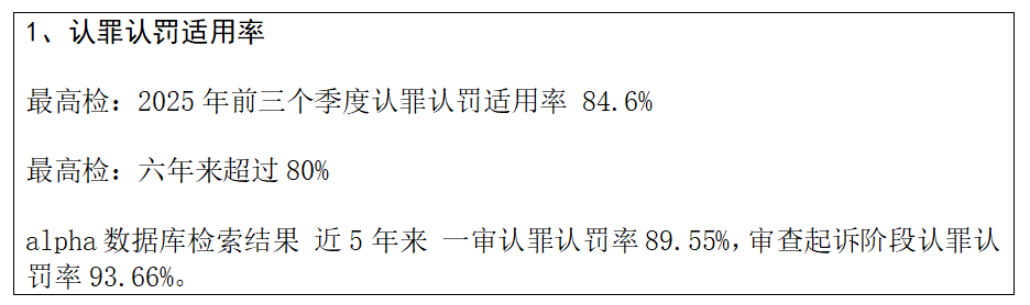 第一组数据涉及认罪认罚的适用率。根据最高检发布的官方数据,2025年前三个季度的认罪认罚适用率高达84.6%,认罪认罚制度实施六年以来,其适用率始终维持在80%以上。我在alpha数据库中也进行了审查起诉阶段和审判阶段的案例检索,所得数据与最高检提供的信息基本吻合:近五年来,审查起诉阶段的认罪认罚适用率达到了93.66%,而一审阶段的适用率则为89.55%。我们讨论认罪认罚语境下的辩护问题,正是基于这些坚实的数据支撑,这几项数据表明:目前八九成的刑事案件都涉及认罪认罚,我们在认罪认罚语境之下讨论刑事辩护是非常有必要的。
