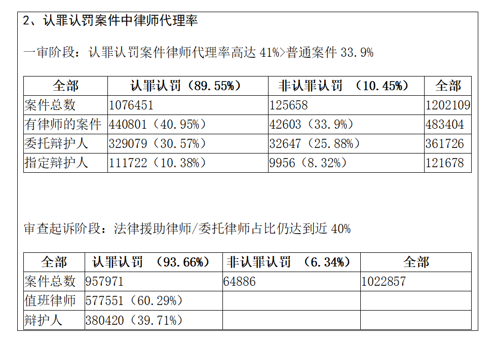 可能有些同学在看到这些数据时,会和我产生同样的疑问:那些未适用认罪认罚的10%-20%的案件是否律师代理较多?尽管适用了认罪认罚的案件占比高达八九成,但其辩护率却相对较低?