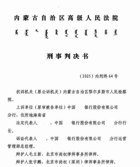 2025年12月9日,内蒙古自治区高级人民法院第二次二审开庭审理本案。2025年12月29日,作出(2025)内刑终64号刑事判决书,驳回检察机关抗诉,维持对“某商业银行分行无罪”的认定。历时6年的无罪辩护,终告功成!