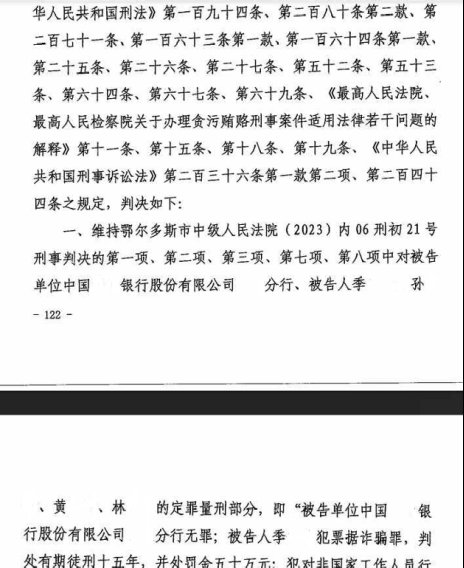 2019年12月26日,鄂尔多斯市中级人民法院作出(2018)内06刑初7号刑事判决,判决某商业银行分行、姚某、季某某、孙某某犯票据诈骗罪,姚某犯非国家工作人员受贿罪,季某某、孙某某犯对非国家工作人员行贿罪。