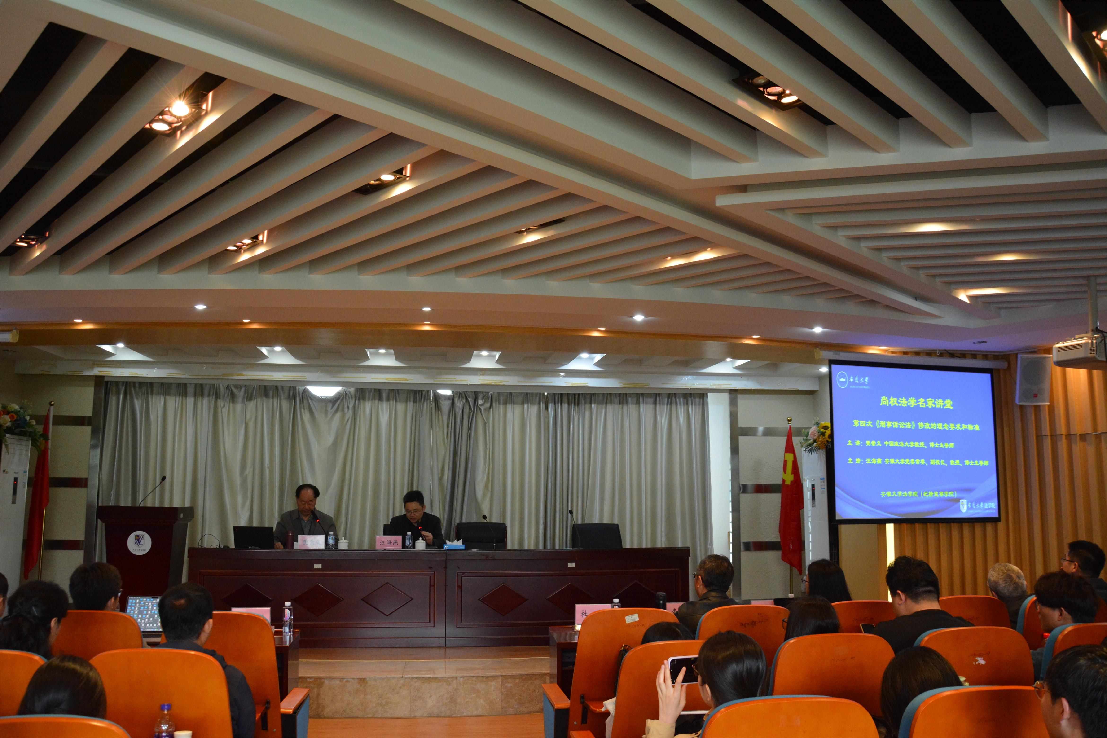 本次讲座特邀中国政法大学诉讼法学研究院名誉院长、博士生导师、著名法学家樊崇义教授担任主讲嘉宾,围绕《第四次〈刑事诉讼法〉修改的理念要求和标准》作专题报告。安徽大学党委常委、副校长汪海燕教授主持本次讲座。讲座内容兼具理论深度与实践价值,吸引了众多师生及法律实务界人士到场聆听。